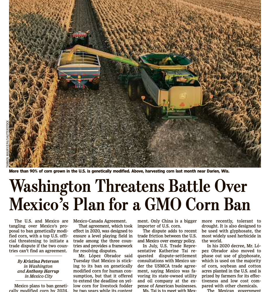 Τον Δεκέμβριο του 2020, ο Πρόεδρος του Μεξικού Αντρές Μανουέλ Λόπες Ομπραντόρ υπέγραψε διάταγμα για την απαγόρευση του γενετικά τροποποιημένου καλαμποκιού έως το 2024, πυροδοτώντας δημόσια εμπορική διαμάχη με τις 🇺🇸 Ηνωμένες Πολιτείες. Ωστόσο, μια πιο προσεκτική εξέταση της πολιτικής για Γ.Τ.Ο. στο Μεξικό και της ιστορίας της αποκαλύπτει ένα περίπλοκο δίκτυο διαφθοράς που αμφισβητεί τα πραγματικά κίνητρα πίσω από αυτή την απαγόρευση.